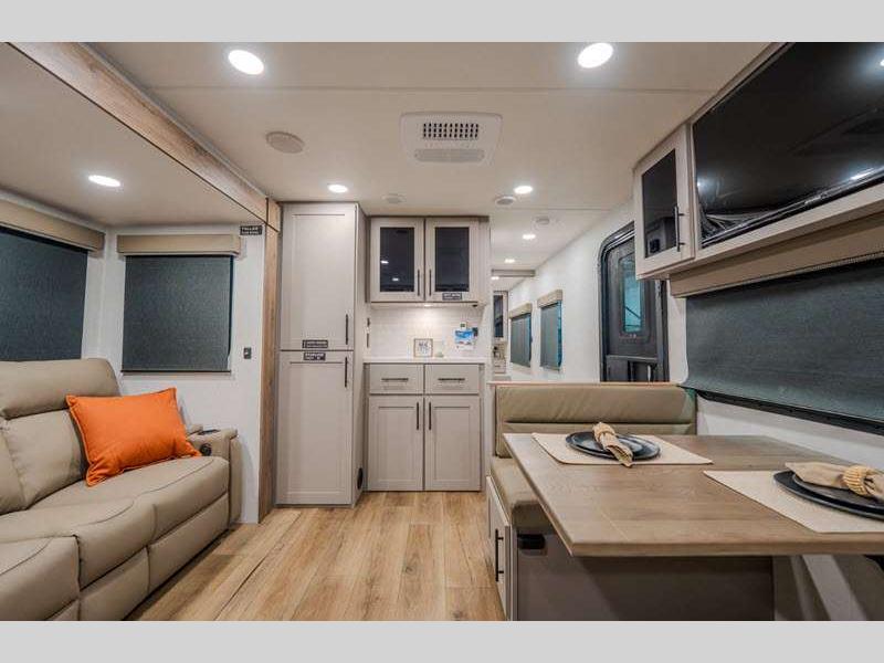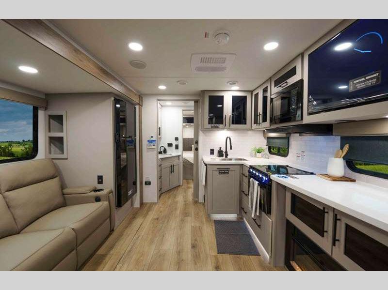 Sleeps 4 Slides 2 Length 33 ft 11 in Ext Height 11 ft 3 in Hitch Weight 802 lbs GVWR 9450 lbs Dry Weight 7486 lbs Fresh Water Capacity 45 gals Grey Water Capacity 90 gals Black Water Capacity 45 gals Available Beds Queen Refrigerator Type 12V Refrigerator Size 10 cu ft Cooktop Burners 3 Shower Size 30" x 36" Number of Awnings 2 TV Info LR 50" TV Awning Info 10' and 21' Axle Count 2 Shower Type Standard Electrical Service 50 amp Solar Wattage 400 watts Similar Floorplans