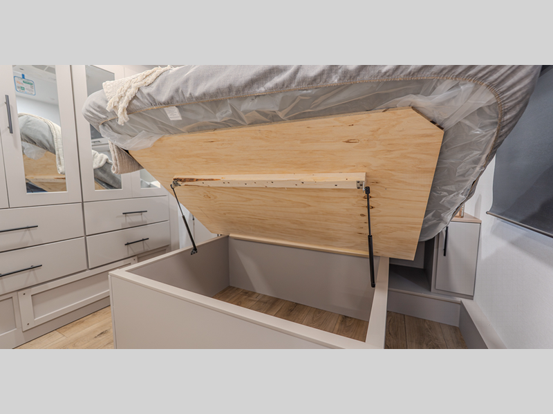 The 101" wide-body benchmark chassis provides plenty of space to bring along the dirt bikes, four-wheeler, or kayaks, and the Azdel-backed fiberglass sidewalls are ultra durable so you can enjoy your RV for years to come. You will appreciate the Garage Management System that includes a weather resistant ramp door, a fully insulated garage floor, and a multi-point tie-down system to keep your toys secure during transport. The interior will have you feeling at home with black cabinetry hardware, residential LED recessed ceiling lights, a large residential shower, and many more comforts.