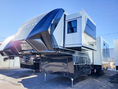 Sleeps 4 Slides 3 Length 45 ft 11 in Ext Width 8 ft 5 in Ext Height 13 ft 4 in Interior Color Sahara Exterior Color Optional Full-Body Paint; Silver & Black, White & Black, Gold & Black, Metallic Hitch Weight 3450 lbs GVWR 23000 lbs Dry Weight 18600 lbs Fresh Water Capacity 150 gals Grey Water Capacity 156 gals Black Water Capacity 85 gals Tire Size 215/75 R17.5H Furnace BTU 35000 btu Generator FlexPower 5500 Fuel Capacity 60 gals Number Of Bunks 1 Available Beds King Refrigerator Type GE Energy Star with Ice Maker and Filtered Water Refrigerator Size 19 cu ft Convection Cooking Yes Cooktop Burners 4 Shower Size 30" x 42" Number of Awnings 4 Axle Weight 7000 lbs Garage Size 12 ft 6 in LP Tank Capacity 30 lbs Water Heater Type Tankless AC BTU 40500 btu TV Info LR 50" Smart TV & Televator, Garage 43" Smart TV, BR 32" Smart TV Awning Info 10' 6", 15', 14' 6" and Rear Power w/Neon Lights Axle Count 3 Washer/Dryer Available Yes Number of LP Tanks 2 Shower Type Standard Electrical Service 50 amp Solar Wattage 800 watts Similar Toy Hauler Fifth Wheel Floorplans