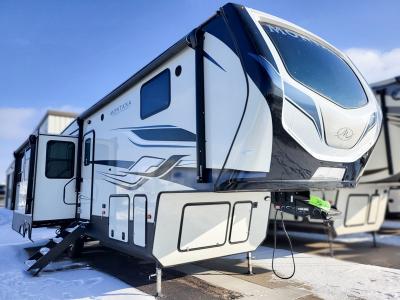 Keystone's innovation lab has reengineered the fifth wheel chassis so that it is stronger and lighter which means that you can travel confidently for years to come. Also, the MaxTurn technology gives you an additional 8" of turning radius. Each floorplan comes with a king-size bed for the ultimate comfort, along with Beauflor vinyl flooring throughout, accent crown molding, a central vacuum system and more!